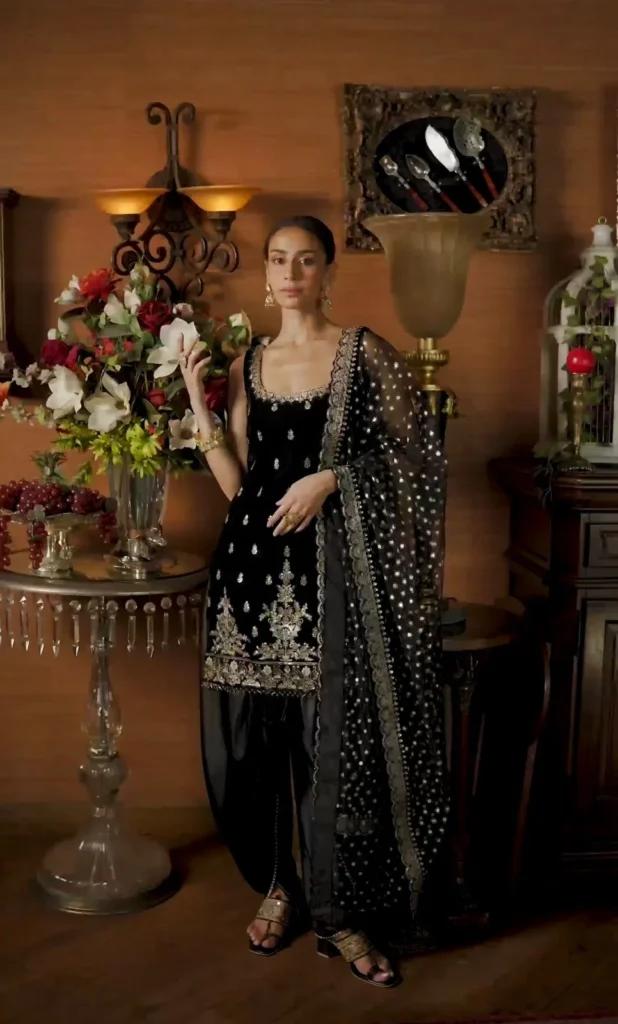 The Black Velvet Ensemble with Elegant Embroidery, available on Azaayah, is the ultimate definition of sophistication with a bold twist. This stunning piece combines the timeless appeal of black velvet with intricate embroidery that highlights the gown’s luxurious essence. Perfect for evening soirées, cocktail parties, or glamorous events, this dress is designed to turn heads wherever you go.