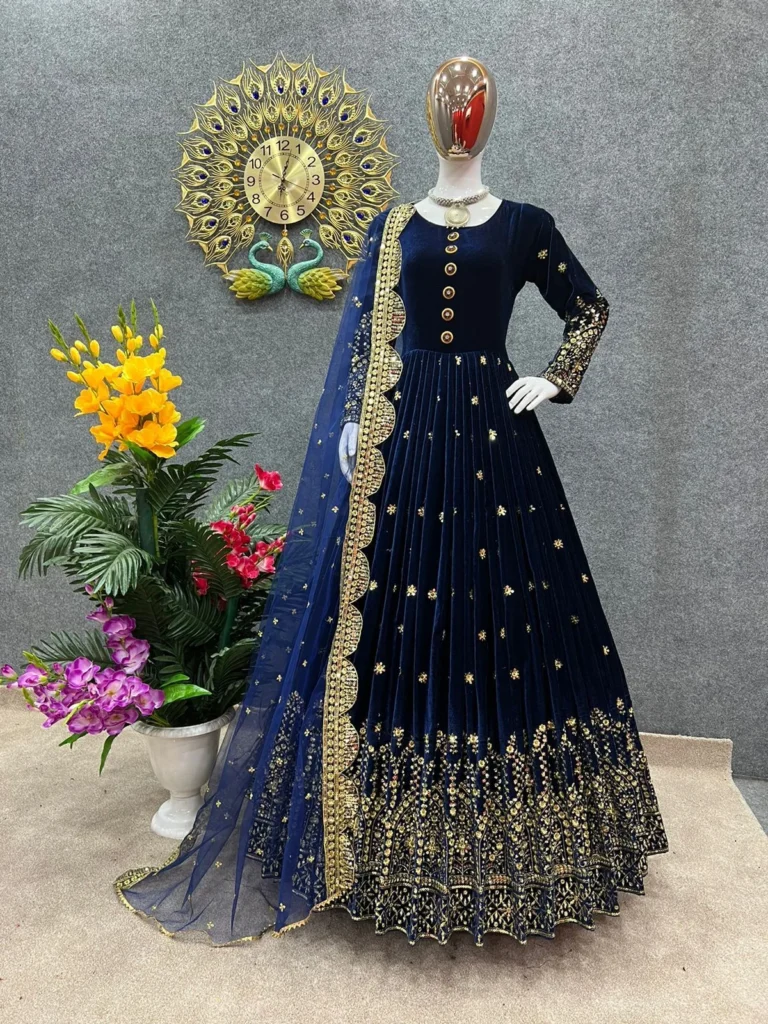 The embroidery work, featuring delicate floral and geometric patterns, adds depth and artistry to the gown. The tailored silhouette flatters the figure, while the rich texture of velvet ensures a regal and polished look. This ensemble effortlessly blends classic charm with contemporary elegance, making it a must-have for the fashion-conscious woman.